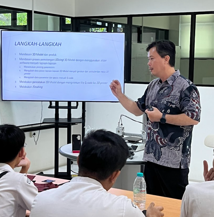 Acara diawali dengan pengenalan program studi TMM kepada siswa, dan dilanjutkan dengan penjelasan apa itu 3D print oleh Prof. Jaya Suteja sebagai pemateri workshop. Para siswa mendengarkan dengan baik bagaimana awal mula mendesain dengan membuat model, melakukan proses slicing, mengkonversi file ke G-code, dan akhirnya mencetak dan melakukan finishing dengan 3D print.