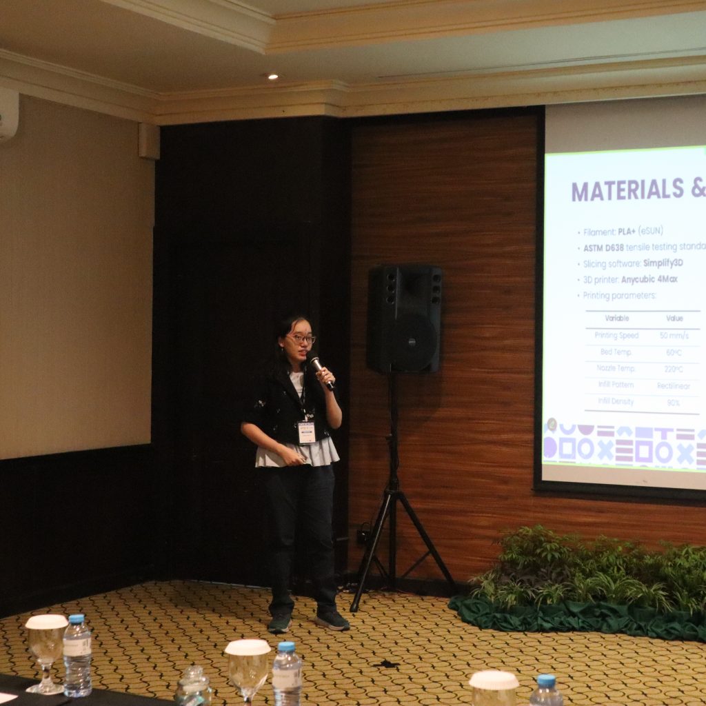 Artikel yang dipresentasikan merupakan pengembangan dari tugas akhir yang ia kerjakan selama menempuh studi di Teknik Mesin dan Manufaktur Universitas Surabaya. Penelitian tersebut berfokus pada evaluasi berbagai jenis material serta metode pelapisan permukaan atau surface coating. Tujuan utama dari penelitian ini adalah untuk meningkatkan kekuatan tarik pada komponen hasil 3D printing yang menggunakan bahan PLA.
